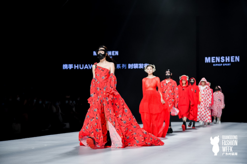 在2021年11月8日广东时装周-秋季闭幕式MENSHEN HIPHOPSPORT携手HUAWEI P5系列时装发布中,模特们身着印有“门神”图案的红色帽衫,气势磅礴地走入T台中央,震撼开场。在充满科技感的音乐中,MENSHEN HIPHOPSPORT呈现了一场国潮盛宴,将中国元素与优雅、嬉皮风格巧妙的混合一体,展示了东方传统与西方元素交糅的服饰艺术之美,同时通过时尚与科技的融合将闭幕晚会的气氛带至高潮。